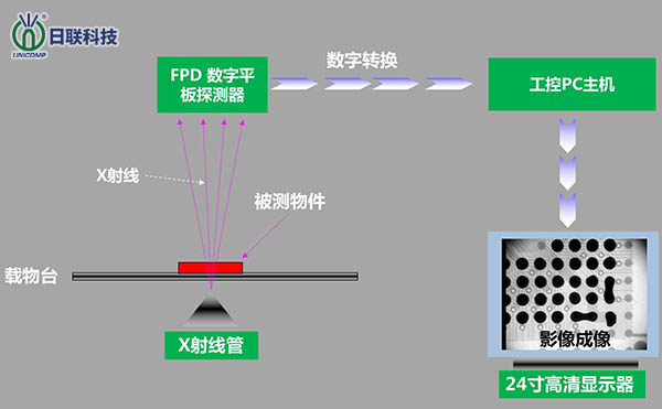 當(dāng)板子沿著導(dǎo)軌進(jìn)入機(jī)器內(nèi)部后,位于板子上方有一X-ray發(fā)射管,其發(fā)射的X射線穿過(guò)板子被置于下方的探測(cè)器(一般為攝像機(jī))所接受,由于焊點(diǎn)中含有可以大量吸收X射線的鉛,因此與穿過(guò)玻璃纖維銅、硅等其他材料的X射線相比,照射在焊點(diǎn)上的X射線被大量吸收,而呈現(xiàn)黑點(diǎn)產(chǎn)生良好的圖像,使得對(duì)焊點(diǎn)的分析變得相當(dāng)簡(jiǎn)單直觀,故簡(jiǎn)單的圖像分析算法便可自動(dòng)且可靠地檢驗(yàn)焊點(diǎn)的缺陷。