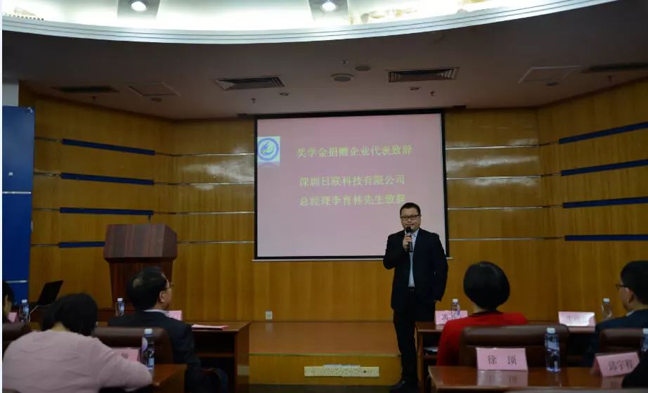 **學(xué)院黨委滿杰書記代表全體獲得獎學(xué)金的同學(xué),向日聯(lián)科技表示衷心的感謝!感謝公司專門設(shè)立“劉駿獎學(xué)金”,鼓勵和支持我們學(xué)生更好地完成學(xué)業(yè)。你們這種創(chuàng)業(yè)精神和服務(wù)社會、回報社會的經(jīng)營理念非常值得我們敬佩。同時希望獲獎同學(xué)不驕不躁,繼續(xù)努力學(xué)習(xí),創(chuàng)造優(yōu)異成績,為將來回報社會做好準(zhǔn)備,絕不辜負(fù)日聯(lián)科技公司對我們的殷切期望。